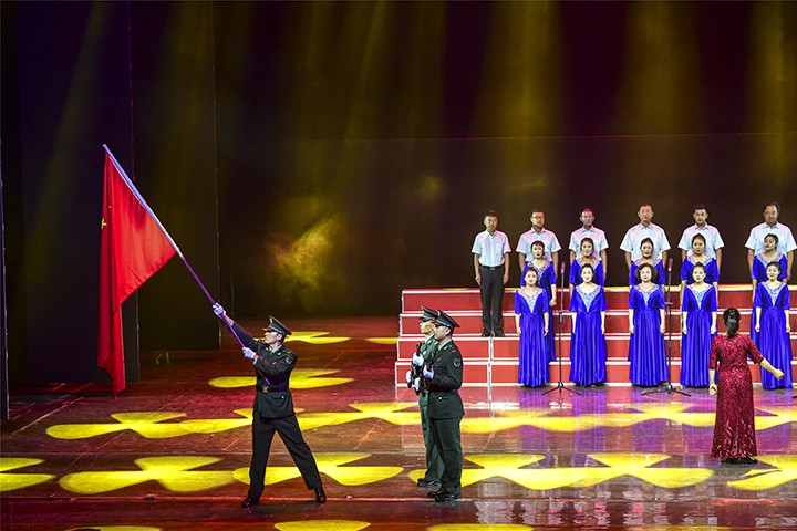 清脆的开场钟声响过,全场灯光渐暗,追光灯下,悠扬的小提琴声响起,《我和我的祖国》的旋律在观众的注目中流淌而出。集团党委宣传部长李文霄和组织部长闫成利深情领唱,全场观众同声合唱《我和我的祖国》。小提琴声、萨克斯声与歌声融为一体,演员与观众融为一体,现场成为一片歌声和红旗的海洋。
