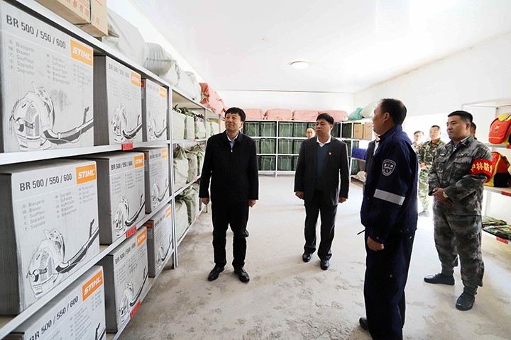 在仲乡林场,王连弟一行观看了仲乡林场森林消防队技战术科目演练。实地查看了扑火机具储备库的灭火油锯、风力灭火机、水泵等扑火器械机具的储备和维护情况。详细询问了林场在森林防火各项工作中的落实情况。