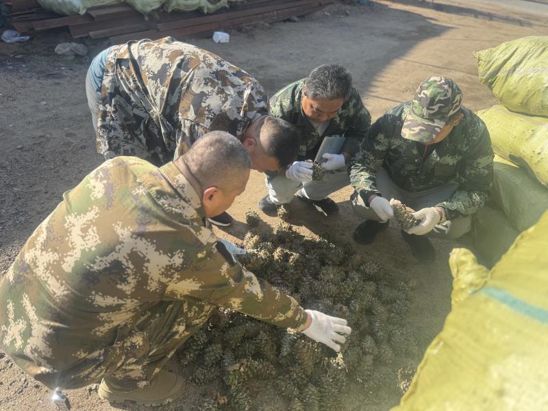 调查中,工作人员秉持科学严谨的态度,与森保员到现地对承包户逐一进行走访调查,对采摘下来的红松果实进行抽样调查,查看种实被害情况。按照调查技术规程,在红松球果存放现场设东南西北中五个点,每个点随机抽取100个球果,逐一检查球果表面,寻找虫孔、虫粪及流脂等被害迹象,查取被害球果数并计算球果被害率,与历年调查结果进行对比分析,对红松球果的受害情况进行全面评估。调查期间,工作人员向承包户详细讲解被害果实随意丢弃可能引发的虫害蔓延风险,指导其掌握科学的清理方法,从源头降低害虫对下一季红松球果的危害。