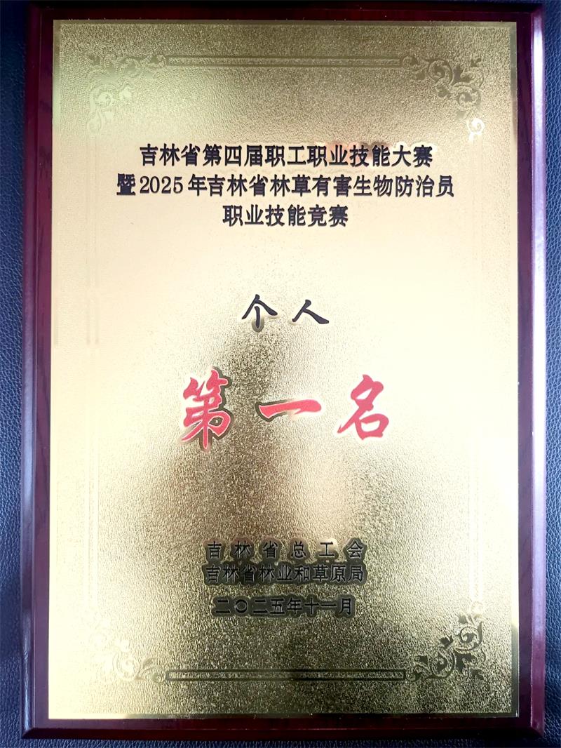 11月4日,吉林省第四届职工职业技能大赛暨2025年吉林省林草有害生物防治员职业技能竞赛决赛圆满落幕。森林病虫防治检疫站高迪同志凭借过硬实力,在全省28名选手中脱颖而出,荣获个人第一名,为公司林业有害生物防治工作增光添彩。