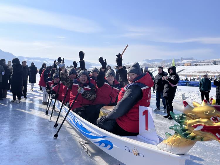 本届赛事是吉林省重点冰雪赛事之一,设置滑冰挑战赛、冰上龙舟邀请赛、雪地健康跑三大核心项目,吸引来自全国19个省、市、自治区的3000余名冰雪运动爱好者齐聚松花江畔。其中冰上龙舟邀请赛参照国际标准打造赛事龙舟,设置12人100米、200米直道竞速赛,通过预赛、半决赛、决赛的递进赛制,将传统龙舟文化与冰雪运动活力深度融合,兼具竞技性与观赏性。 比赛当日,寒风凛冽却挡不住参赛队员的热情。露水河林业有限公司12名队员身着统一队服,精神抖擞、士气高昂,在赛前认真熟悉赛道、磨合配合,反复演练划钎节奏与团队协同动作。随着发令声响,队员们紧握冰钎、齐心协力,在鼓点与呐喊声中同步发力,冰钎翻飞、龙舟疾驰,在晶莹的冰面上划出整齐有力的轨迹,将“同舟共济、奋勇争先”的团队精神展现得淋漓尽致。赛场边,观众的加油声、欢呼声此起彼伏,为这场冰上竞速增添了热烈氛围。