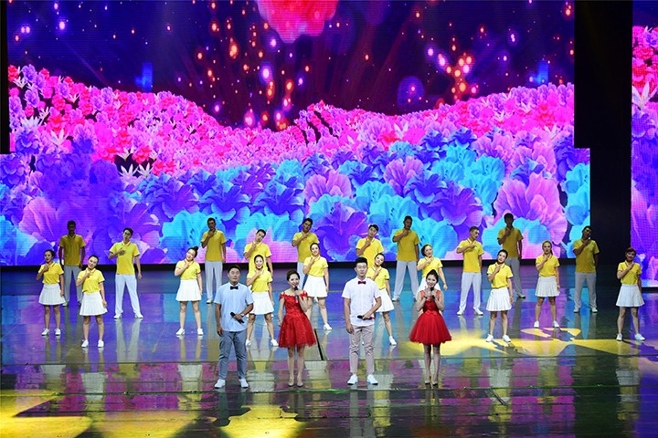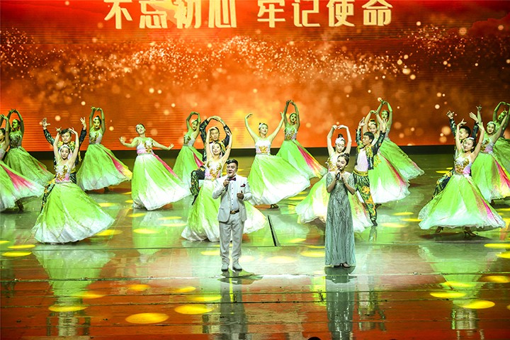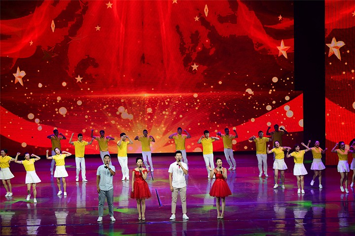 清脆的开场钟声响过,全场灯光渐暗,追光灯下,悠扬的小提琴声响起,《我和我的祖国》的旋律在观众的注目中流淌而出。集团党委宣传部长李文霄和组织部长闫成利深情领唱,全场观众同声合唱《我和我的祖国》。小提琴声、萨克斯声与歌声融为一体,演员与观众融为一体,现场成为一片歌声和红旗的海洋。